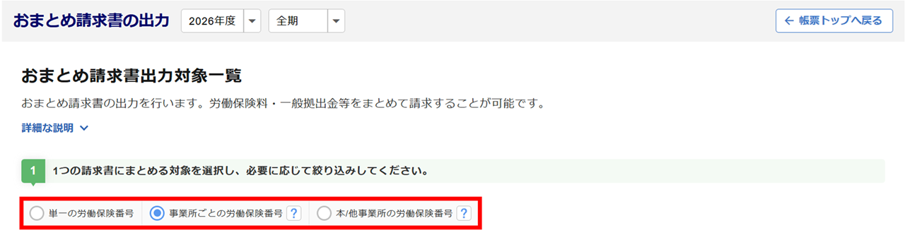 | 労働保険番号をまとめて請求 | 以下から選択します。 ・単一の労働保険番号 ・事業所ごとの労働保険番号 二元適用事業所の請求を一枚にまとめて作成できます。 ・本/他事業所の労働保険番号 同一顧問先の労働保険番号(顧問先管理および他事業所に登録されている すべての労働保険番号)を合算の対象とします。 管轄の労働局が異なる場合でも、合算して出力します。 送付先住所等の事業所情報は顧問先管理に登録している情報を出力します。 |