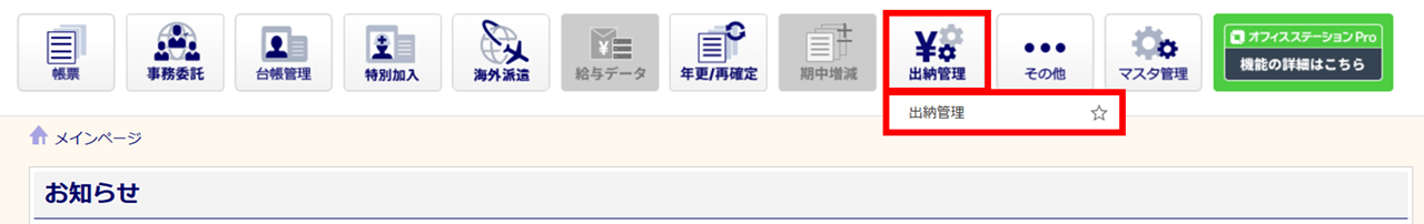 [出納管理]をクリックし、表示されるメニュー内の[出納管理]をクリックします。