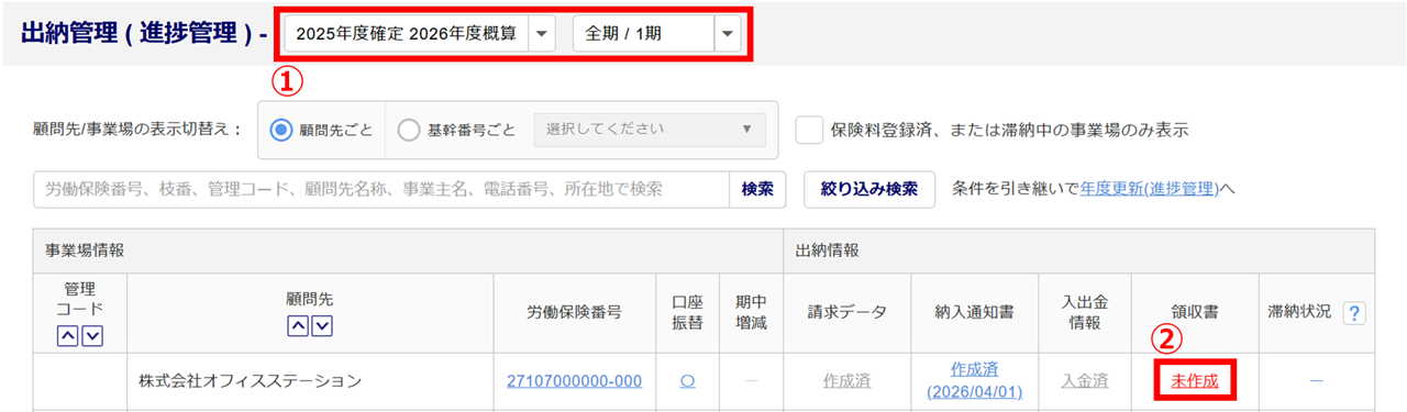 全納の事業場の領収書を発行する場合、「全期」を選択してください。