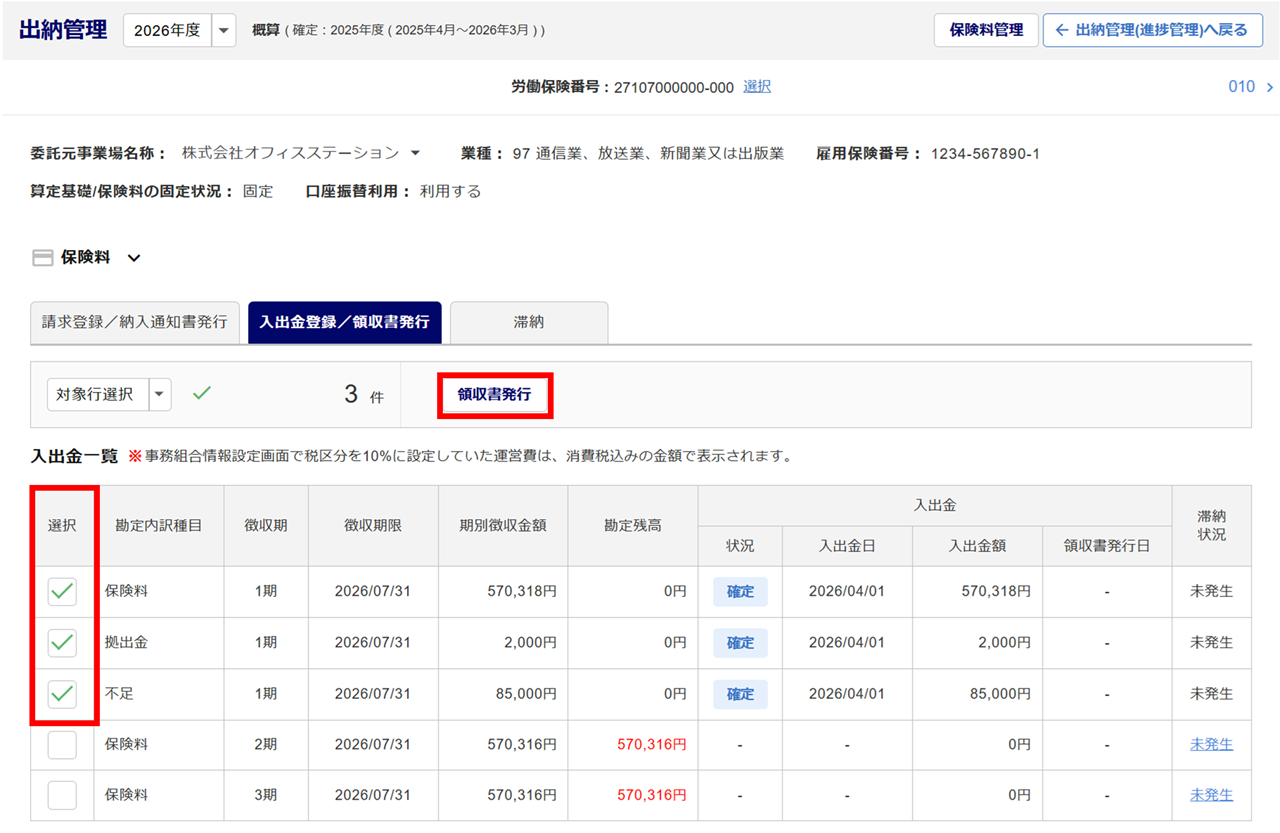 二元適用事業所の労働保険料、一般拠出金を合算し、領収書を一枚にまとめて作成できます。