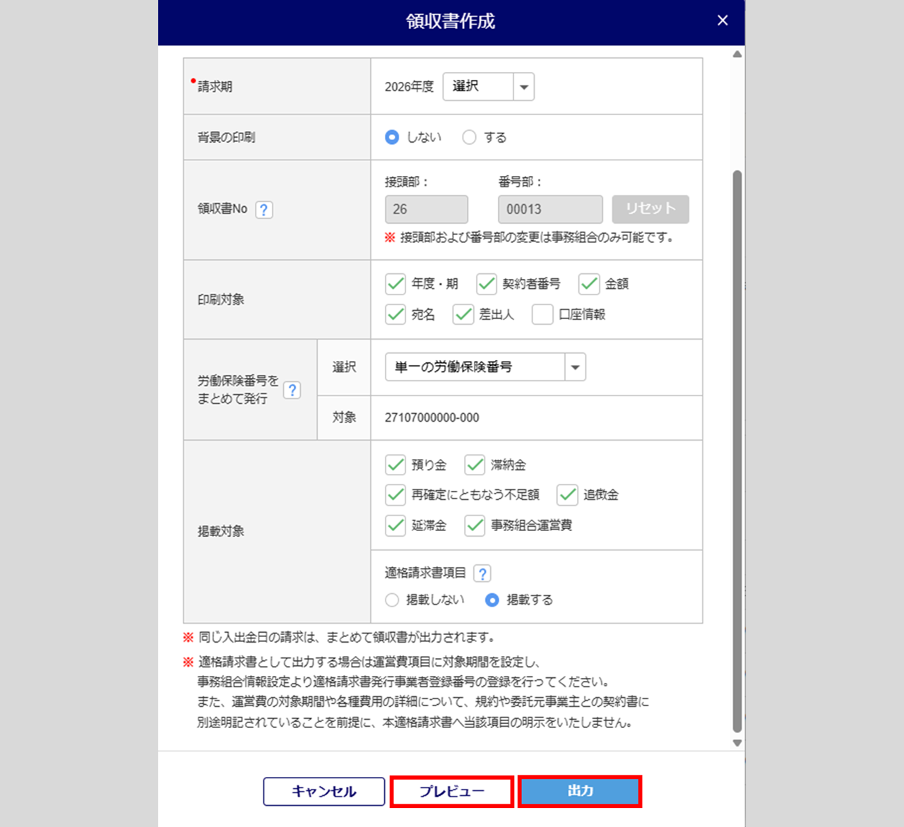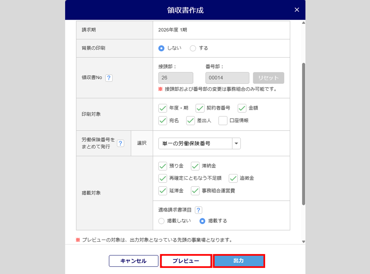 「対象年度」()、領収書を作成する「請求期」()を選択します。