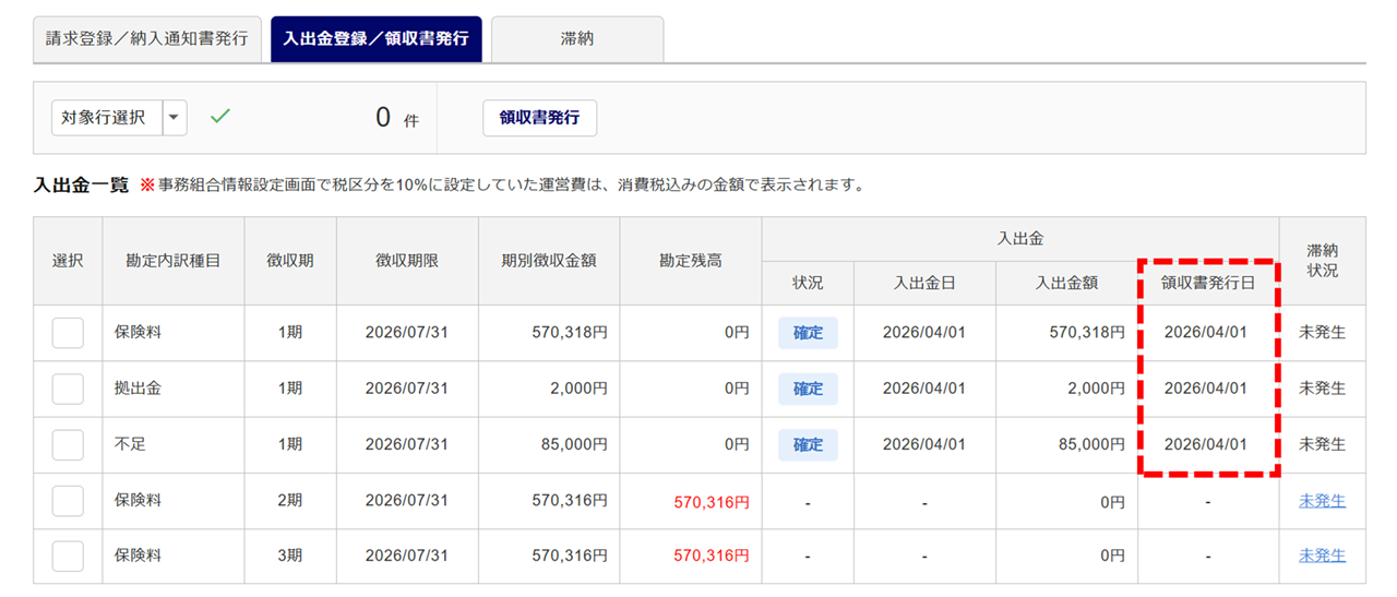 入出金一覧の「領収書発行日」に本日の日付が反映されます。