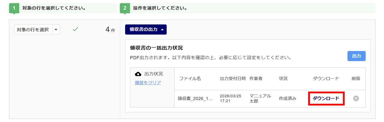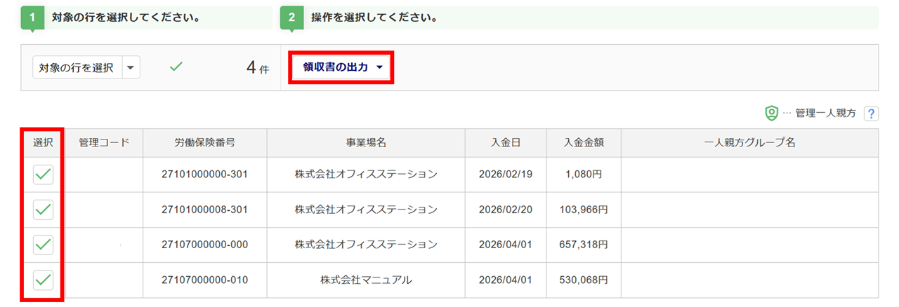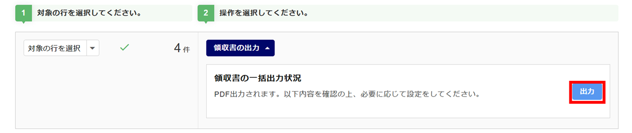 領収書を作成する情報の「選択」列にチェックし、[領収書の出力]をクリックします。