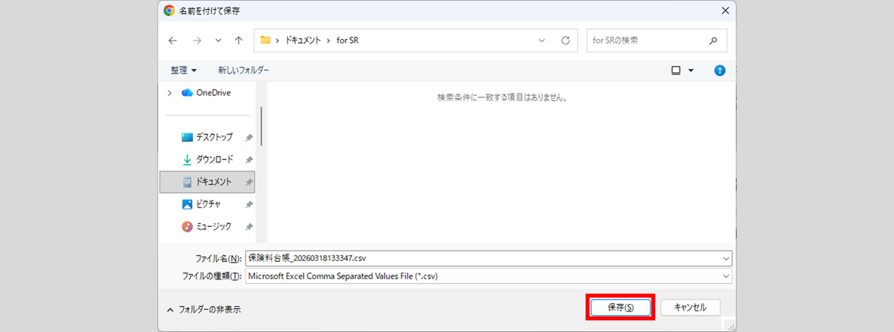 操作しているPCのフォルダ画面が表示されるので、任意のフォルダを指定し、[保存]をクリックします。