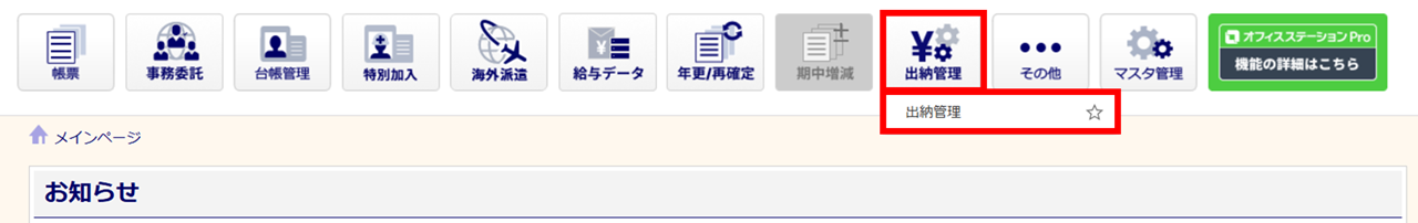 [出納管理]をクリックし、表示されるメニュー内の[出納管理]をクリックします。