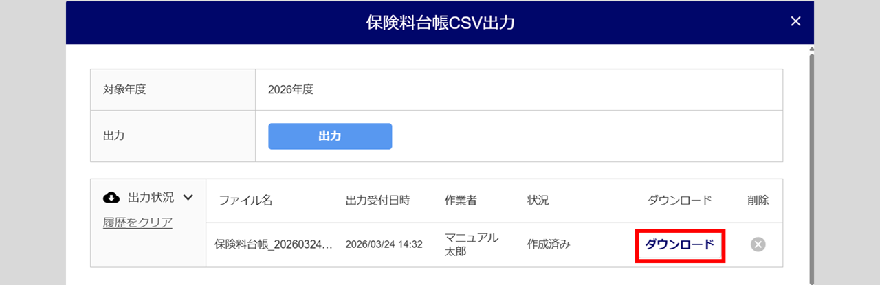 ファイル名は、「保険料台帳_yyyymmddhhmmss.csv」です。