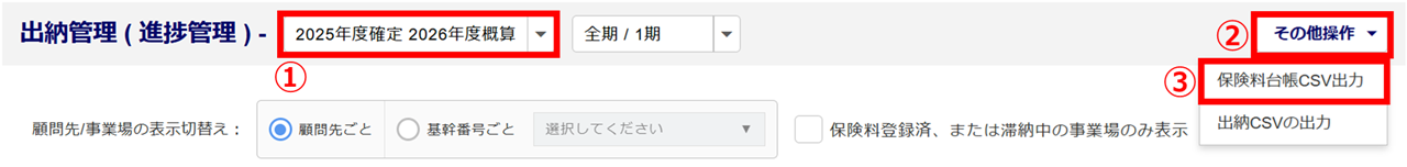 画面右上の[その他操作](②)をクリックし、表示されるメニュー内の[保険料台帳CSV出力](③)をクリックします。