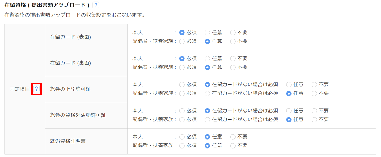 身上変更時の在留資格に関する質問の設定をおこないます。