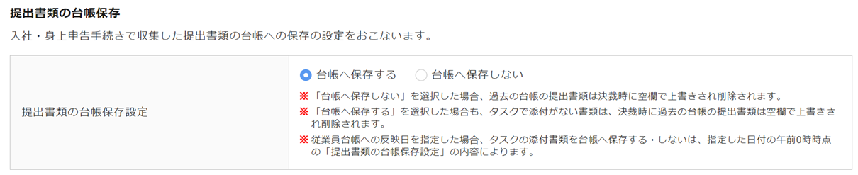 身上変更タスクおよび従業員からの身上変更申請で収集した提出書類をタスクの決裁時に、従業員台帳へ保存するか否かを設定します。
