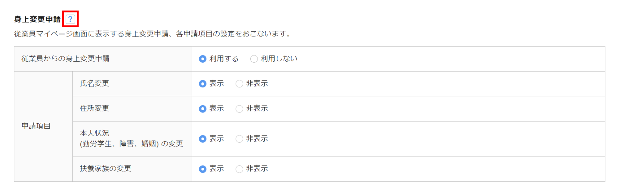 システムを通じての従業員本人からの自発的な申し出を禁止する場合は、「従業員からの身上変更申請」に「利用しない」を設定してください。