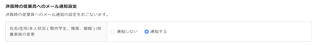 身上変更タスクおよび従業員からの身上変更申請の決裁時に、従業員へ申請結果のお知らせメールを通知するかについて設定します。