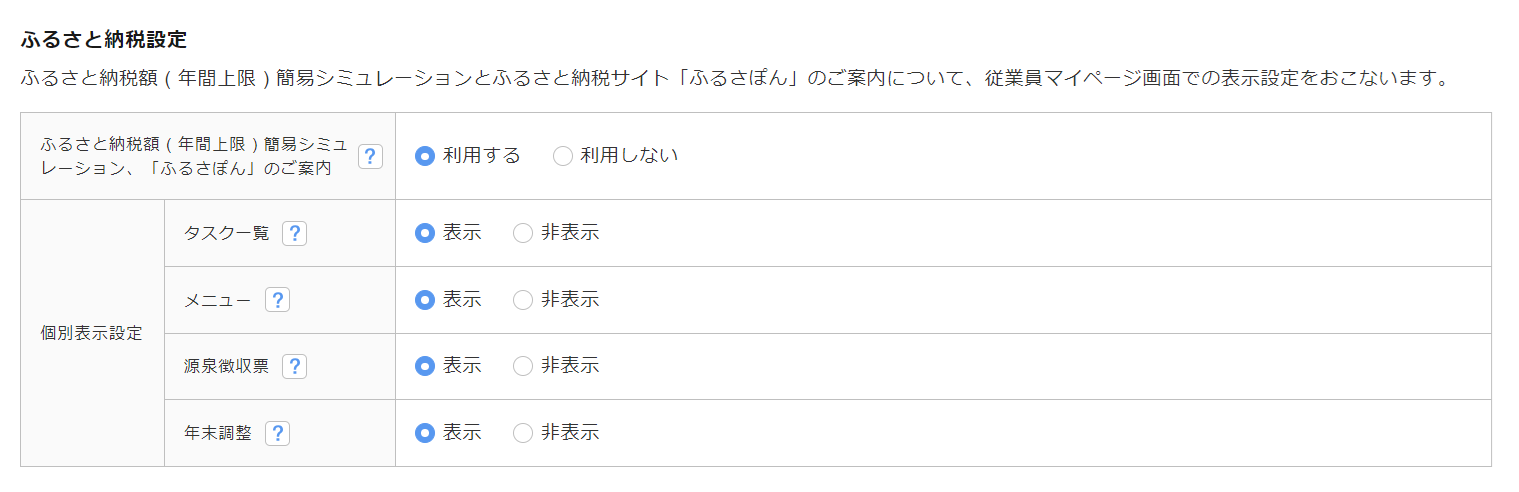 各画面に「ふるさと納税額 ( 年間上限 )簡易シミュレーション」とふるさと納税サイト「ふるさぽん」のご案内を表示するかについて設定します。