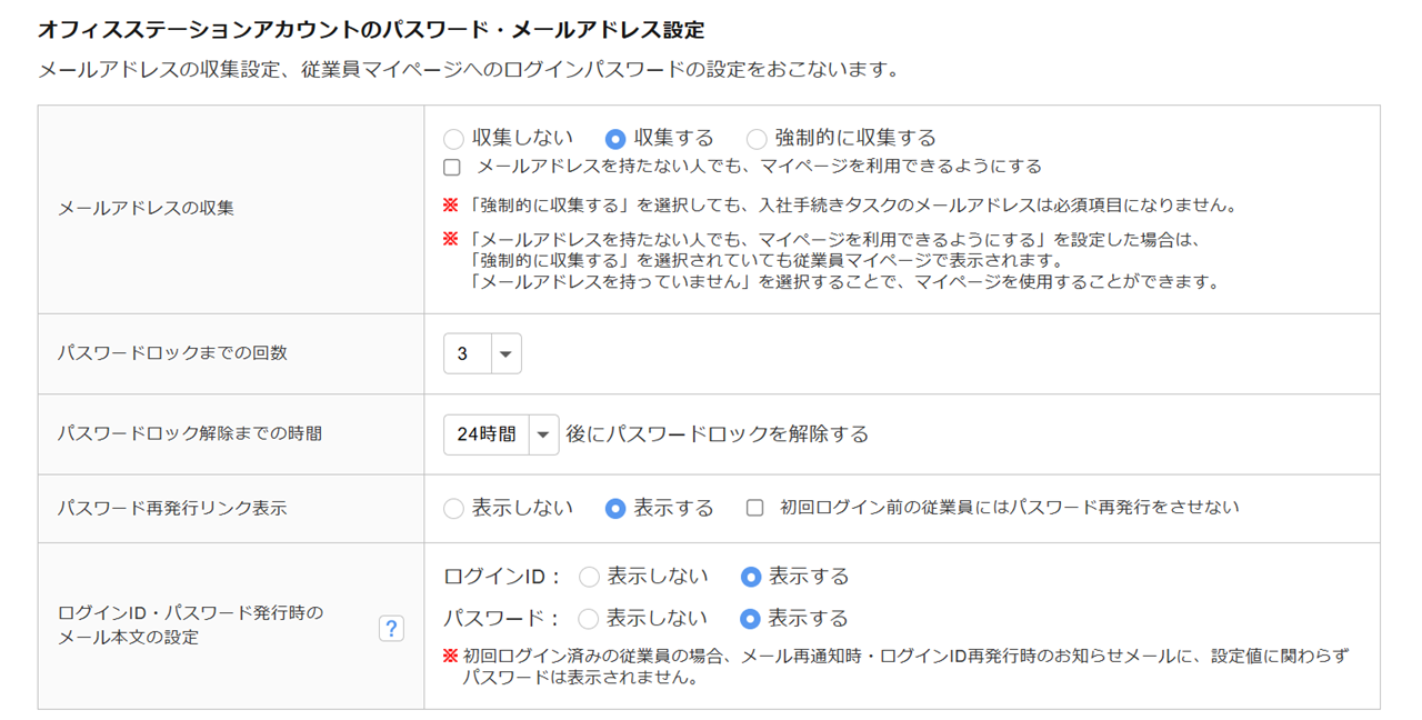 メールアドレスの収集、従業員マイページへのログインパスワードについて設定します。