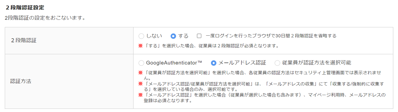 | 2段階認証 | 従業員用マイページのログイン時に、2段階認証をおこなうかについて設定します。 |