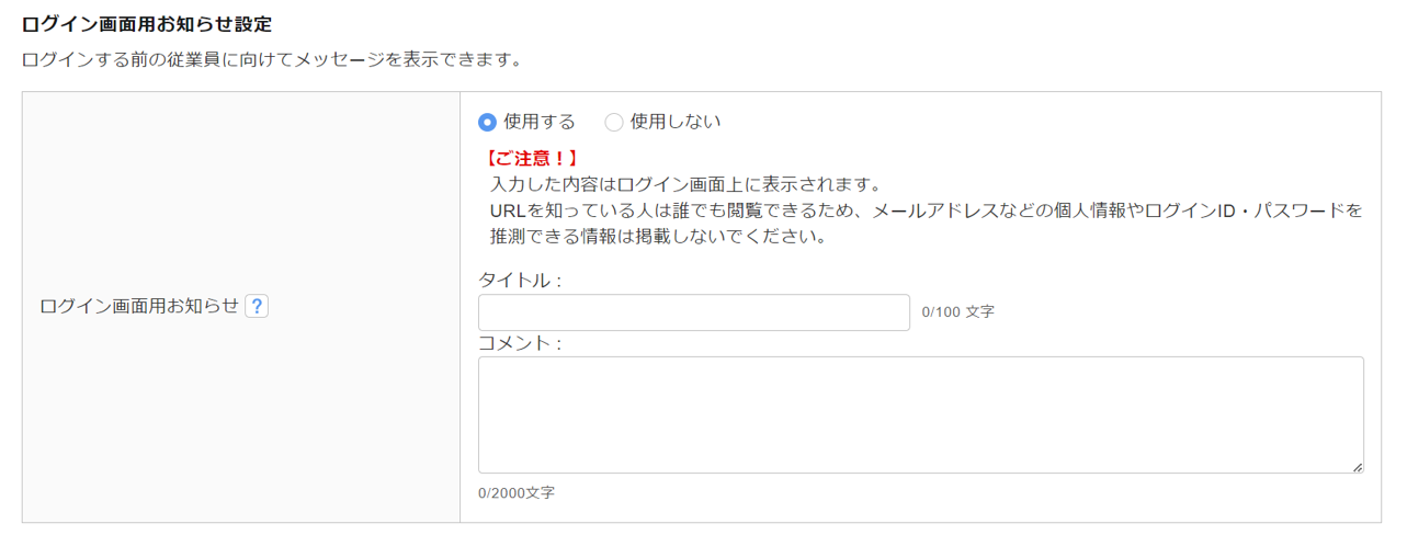 従業員マイページのログイン画面にお知らせを設定する場合、「使用する」を選択し、「タイトル」「コメント」を入力します。