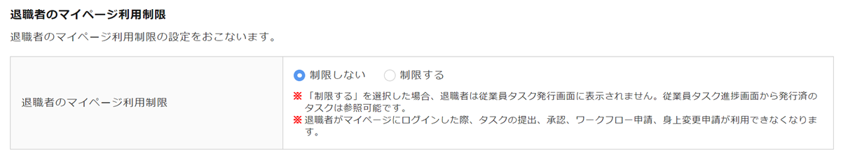 退職した従業員(従業員台帳に昨日以前の「退職年月日」が登録されている従業員)に対して、マイページの利用制限をおこなうか否かを設定します。