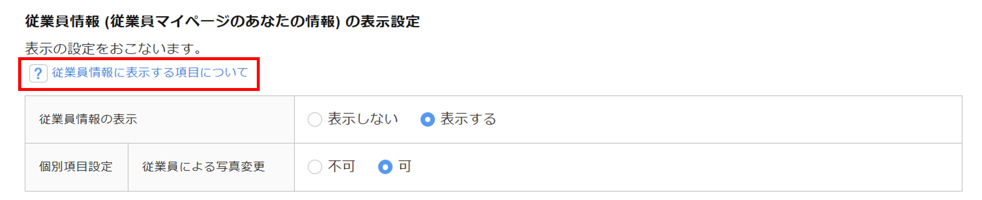 「従業員情報の表示」に「表示する」を選択した場合は、個別項目設定「従業員による写真変更」を設定します。