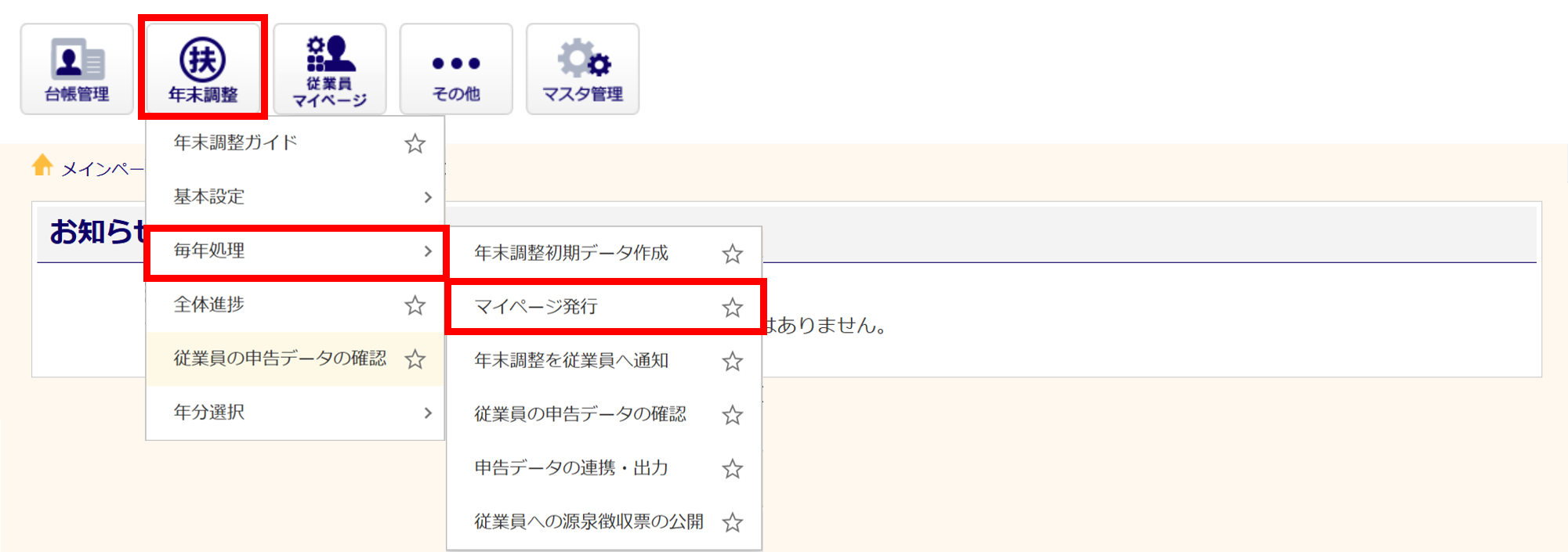 [年末調整]>[毎年処理]>[マイページ発行]をクリックします。