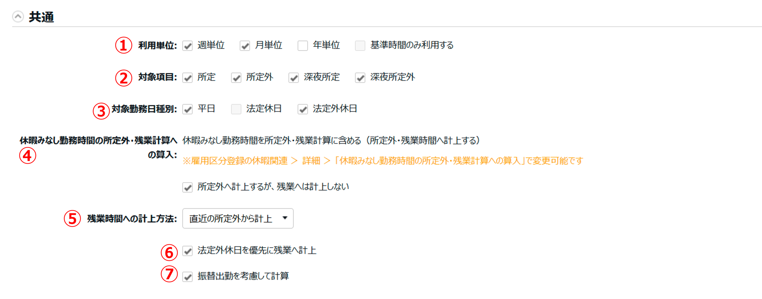 外・残業計算に含める(所定外・残業時間へ計上する)」を選択している場合に、表示