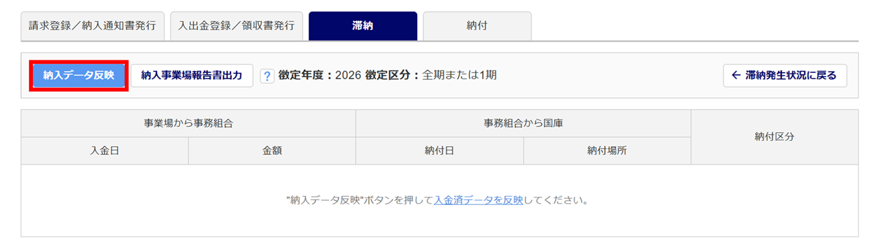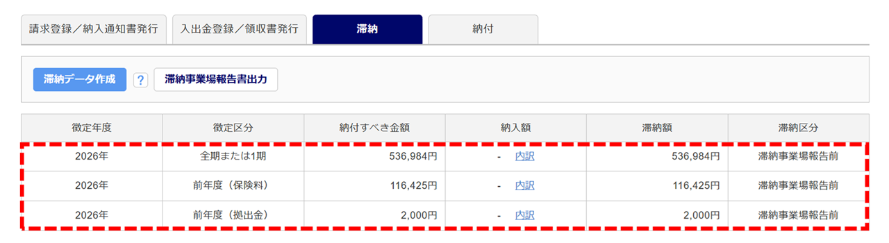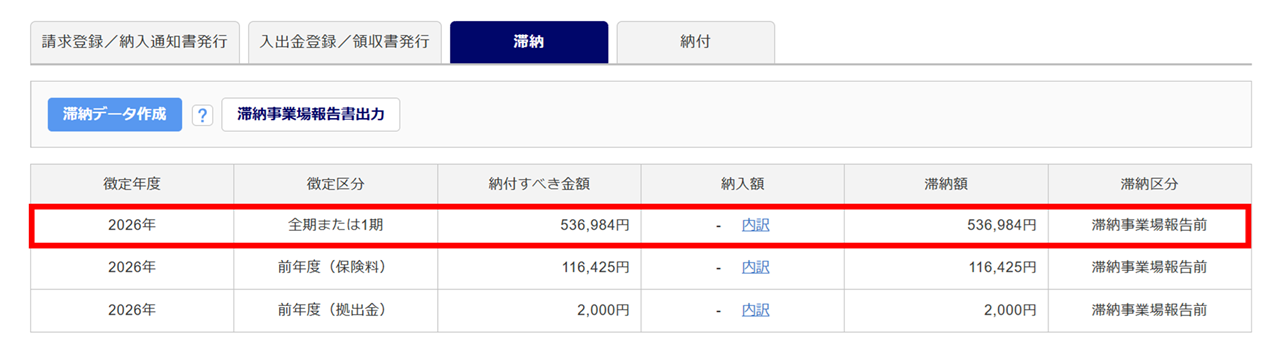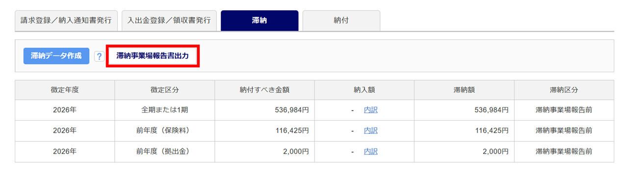 「滞納区分」が「滞納事業場報告前」の滞納データが、滞納事業場報告書の出力対象となります。