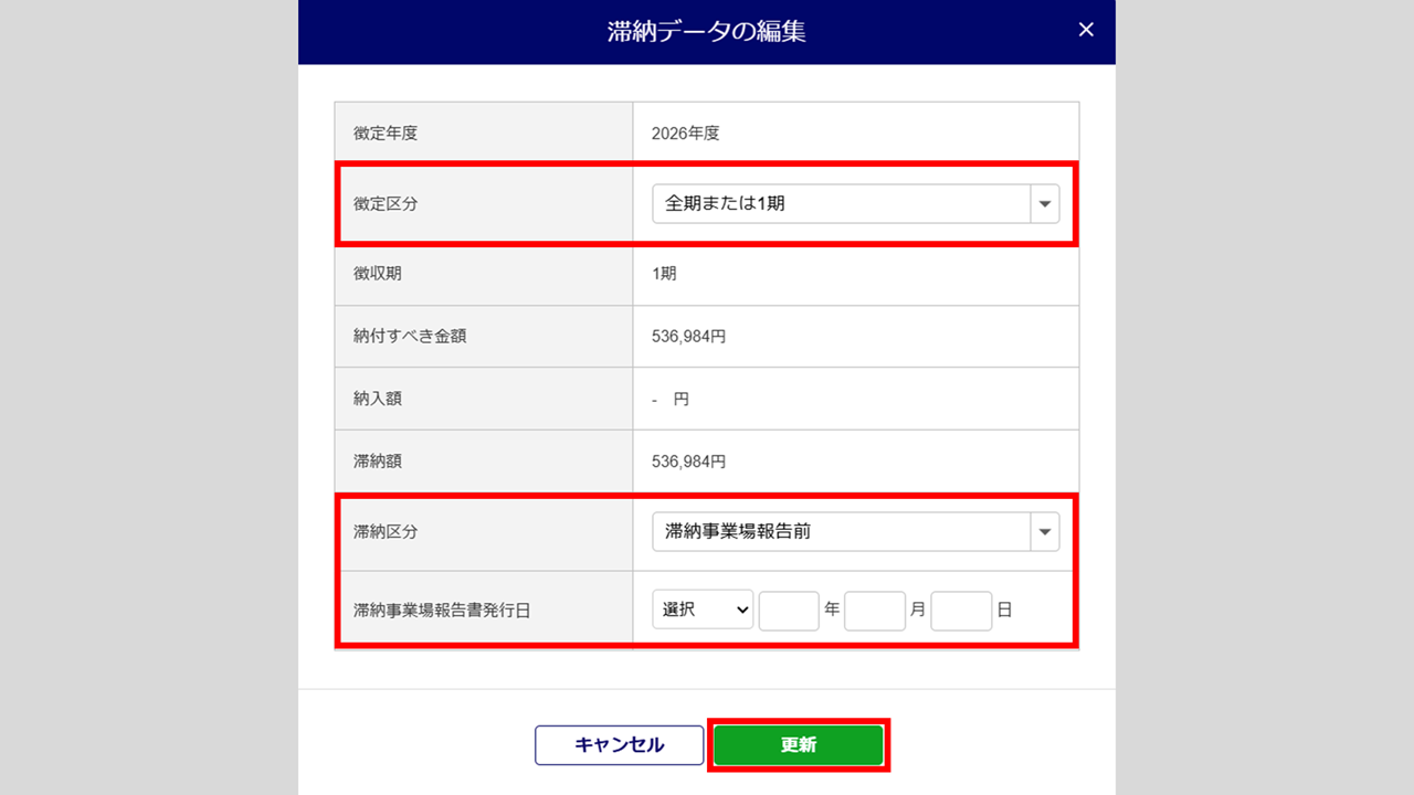 「徴定区分」「滞納区分」「滞納事業場報告書発行日」のいずれかの項目を編集し、[更新]をクリックします。