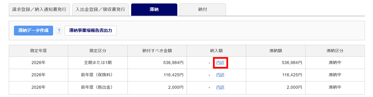 対象の滞納データに対する納入状況を確認・管理するため、「納入額」列の[内訳]をクリックします。