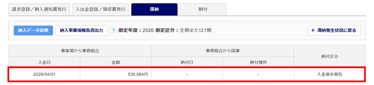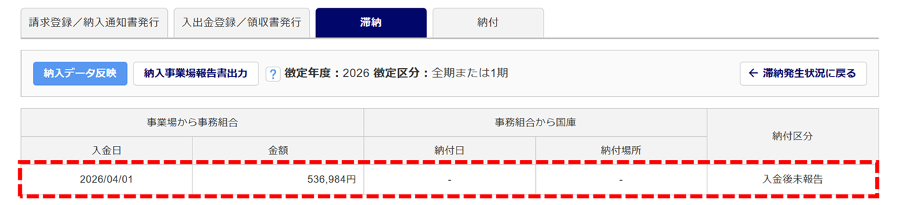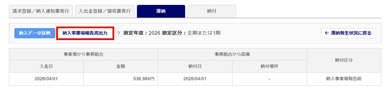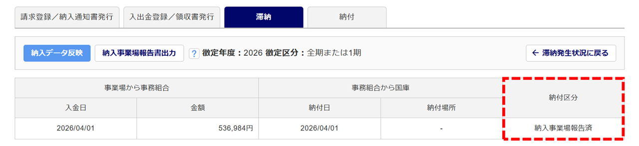 「納入事業場報告書」の作成後、「納付区分」は「納入事業場報告前」から「納入事業場報告済」に変わります。