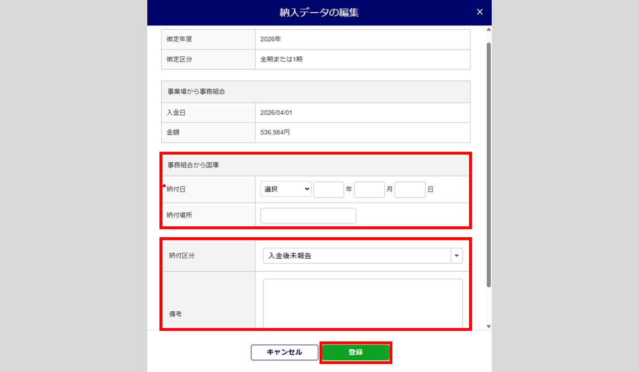 滞納後の保険料・拠出金を当局に納付した「納付日」「納付場所」「納付区分」「備考」を入力します。