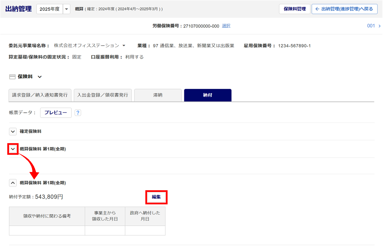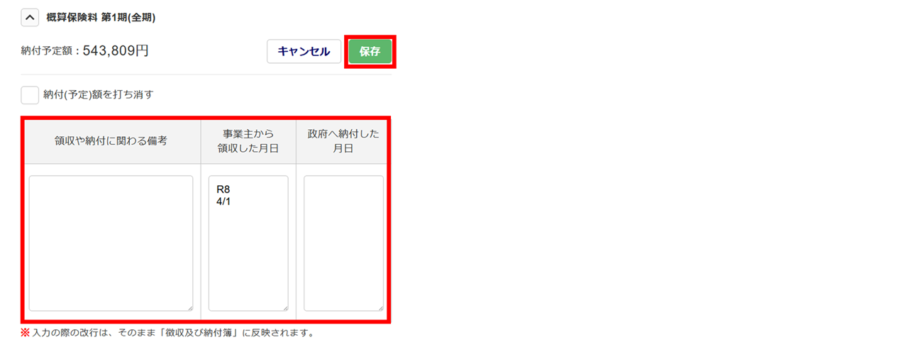 労働保険料等徴収及び納付簿に記載する確定保険料や各期の概算保険料などの情報を編集します。