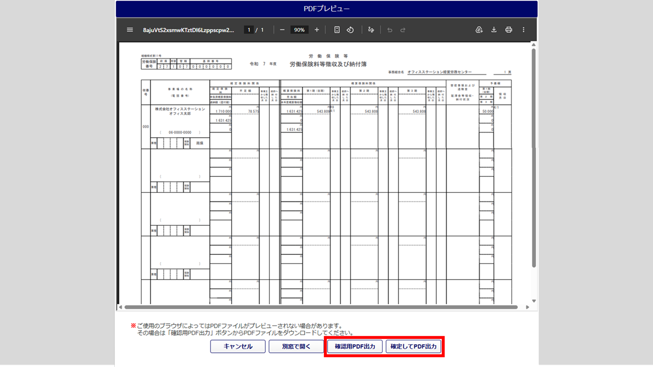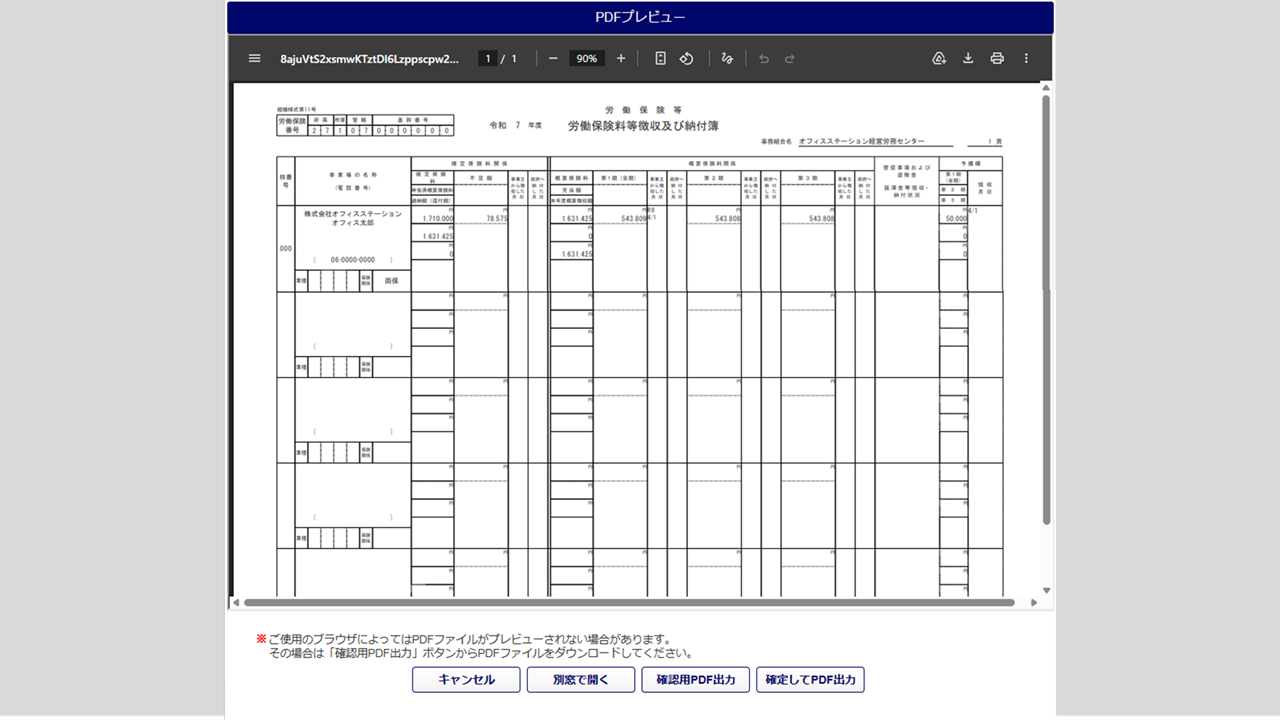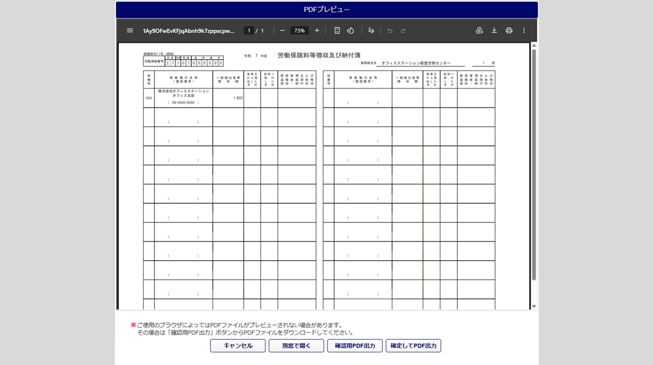 事業場単体の労働保険料等徴収及び納付簿の出力イメージを確認します。
