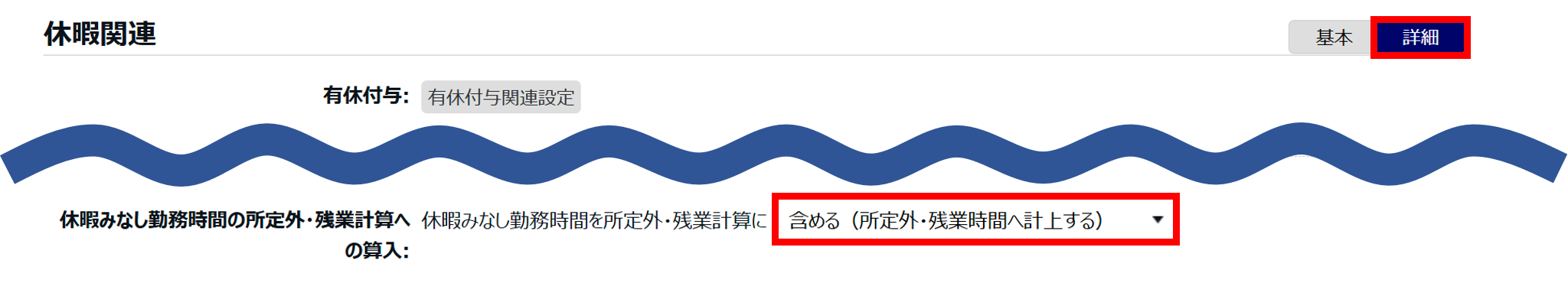 2.同じく「休暇関連」カテゴリの[詳細]内、「休暇みなし勤務時間の所定外・残業計算への算入」にて「含める(所定外・残業時間へ計上する)」を選択します。