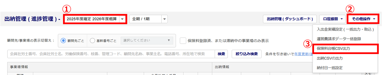 画面右上の[その他操作](②)>[保険料台帳CSV出力](③)をクリックします。