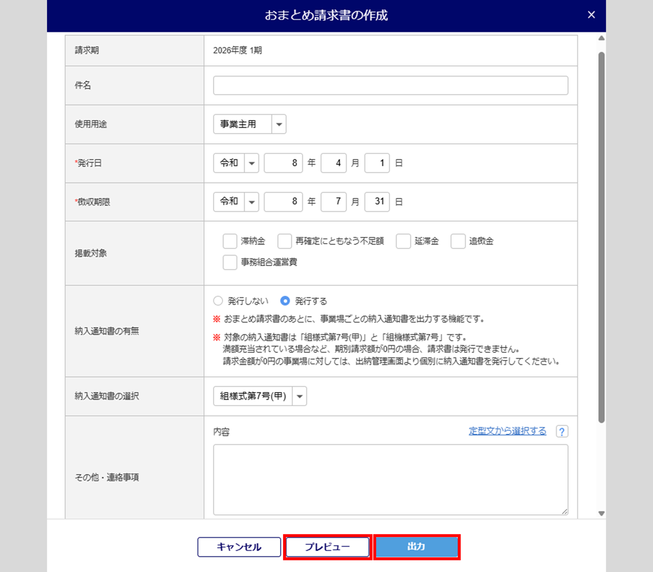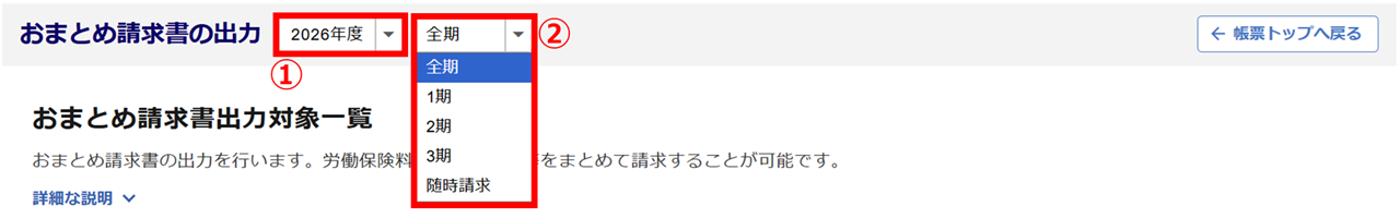 「対象年度」()、おまとめ請求書を作成する「請求期」()を選択します。