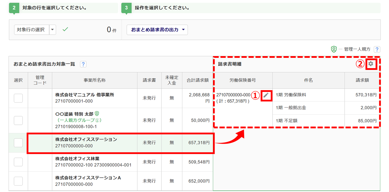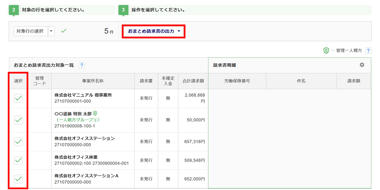 「おまとめ請求書出力対象一覧」の対象をクリックすると、「請求書明細」欄に明細が表示されます。