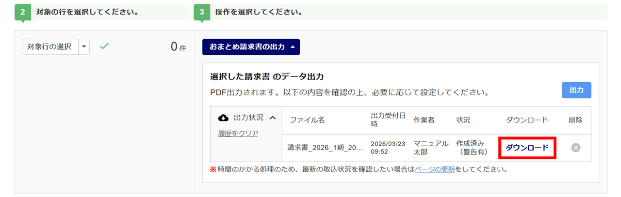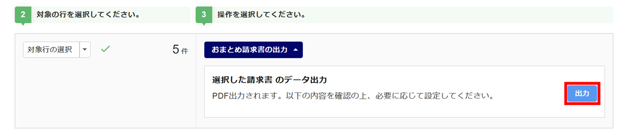 おまとめ請求書を作成する対象の「選択」列にチェックし、[おまとめ請求書の出力]をクリックします。