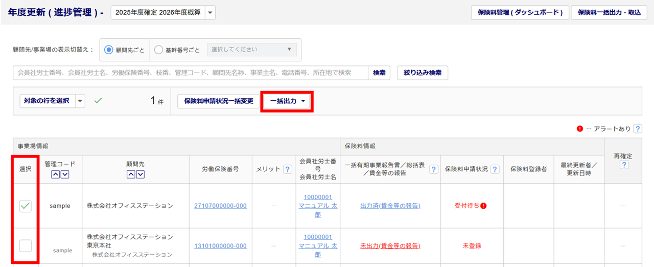 帳票を出力する対象の「選択」列にチェックし、[一括出力]をクリックします。