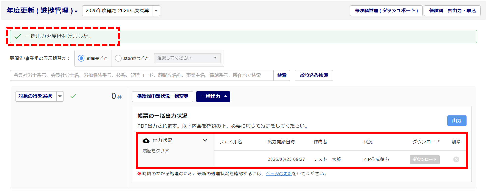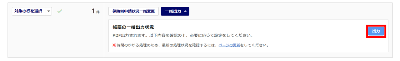 画面上部に「一括出力を受け付けました。」と、「出力状況」欄が表示されます。
