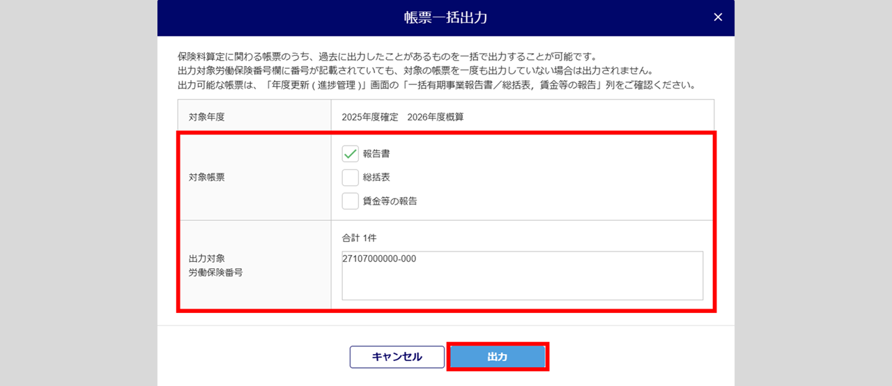「出力対象労働保険番号」を確認し、[出力]をクリックします。