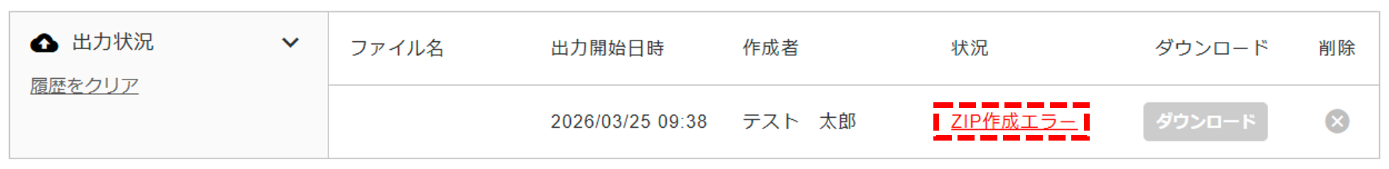 出力時にエラーが発生した場合、「状況」に「ZIP作成エラー」と表示されます。