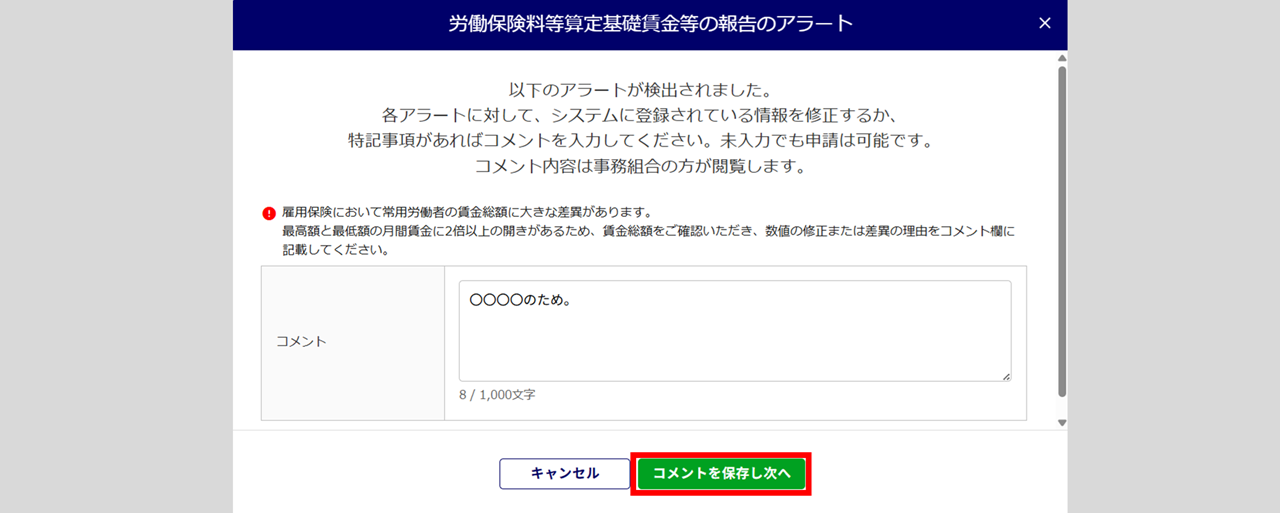 入力内容が正しい旨を「コメント」欄に入力し、[コメントを保存し次へ]をクリックします。