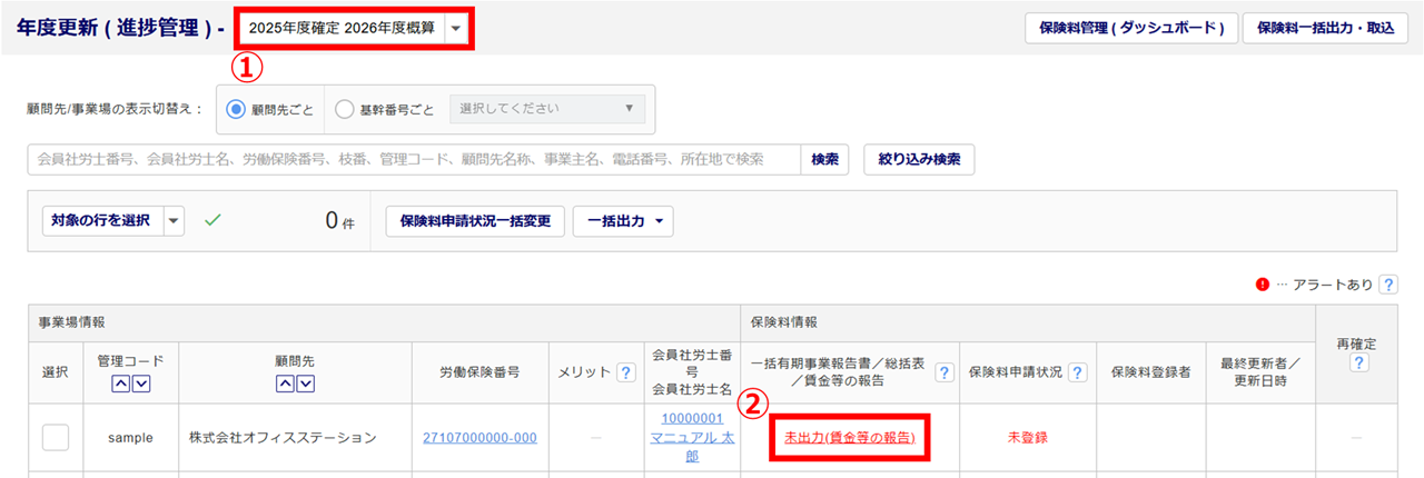 「対象年度」()を選択し、「労働保険料等算定基礎賃金等の報告」を作成する事業場の[未出力(賃金等の報告)]()をクリックします。