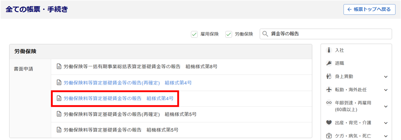 [労働保険料等算定基礎賃金等の報告 組様式第4号]をクリックします。
