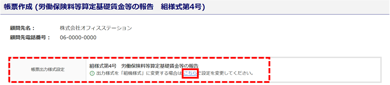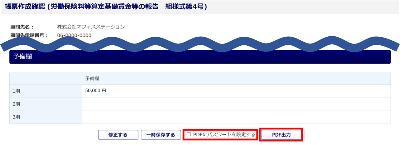 「帳票作成確認(労働保険料等算定基礎賃金等の報告 組様式第4号)」画面が表示されます。