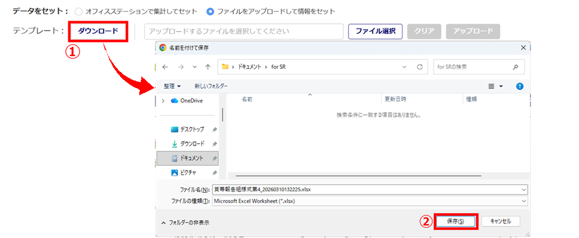 [ダウンロード]()をクリックします。操作しているPCのファイル画面が表示されますので、任意のフォルダを指定し、[保存]()をクリックします。
