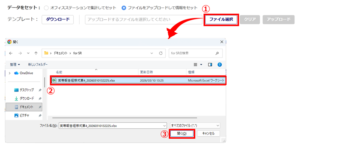 「帳票作成 (労働保険料等算定基礎賃金等の報告 組様式第4号)」画面にて、[ファイル選択]()をクリックします。操作しているPCのフォルダ画面が表示されるので、対象のファイル()をクリックし、[開く]()をクリックします。