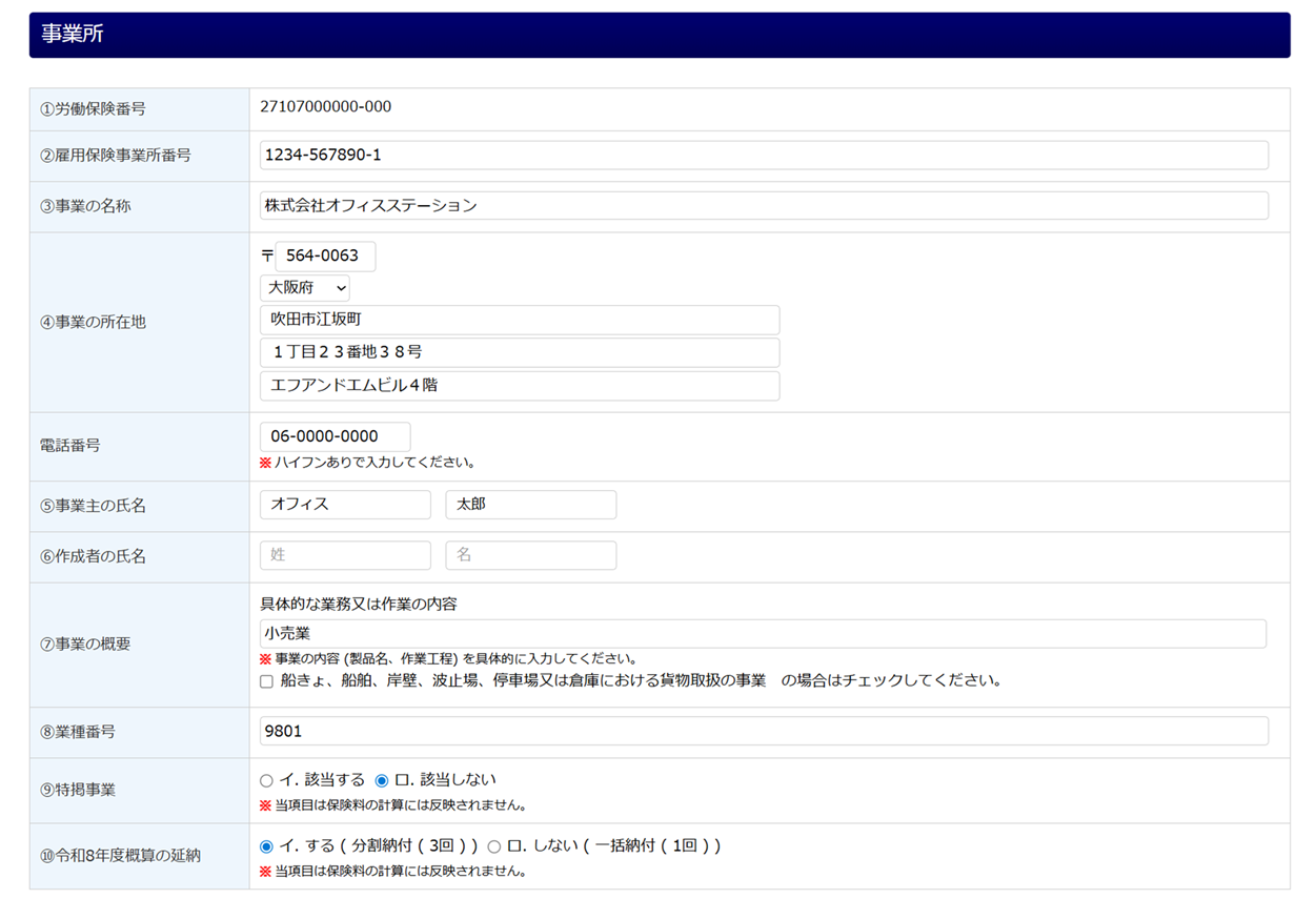 雇用保険の対象者が存在する場合、「雇用保険 (対象者数及び賃金)」欄を入力します。