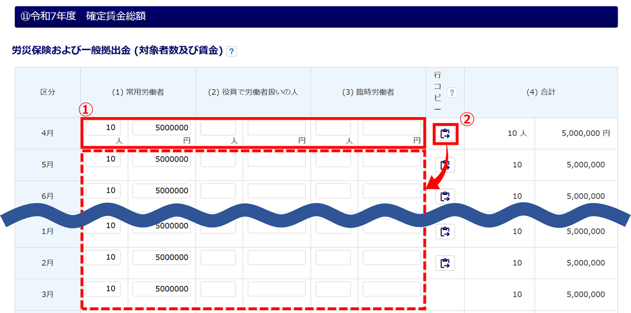 「対象者数及び賃金」()を入力した行の[]()をクリックすると、入力した内容が、入力行以降から3月までの各月にコピーされます。