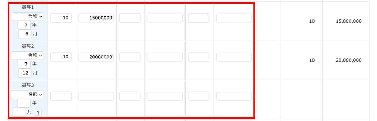 賞与が年4回以上ある場合は、「賞与3」に3回目以降の合計額を入力してください。