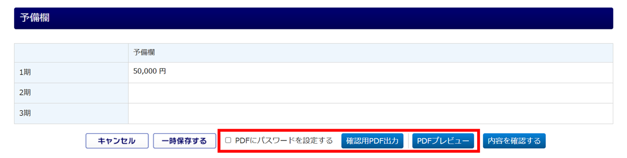 作成した帳票をPDFに出力して確認する場合は、[確認用PDF出力]をクリックします。