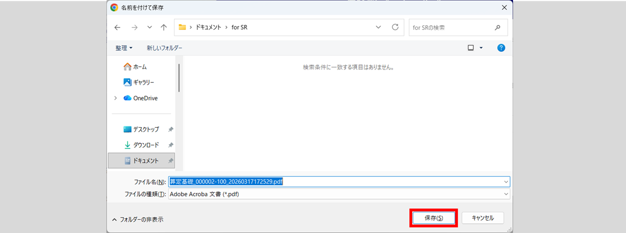 操作しているPCのファイル画面が表示されますので、任意のフォルダを指定し、[保存]をクリックします。